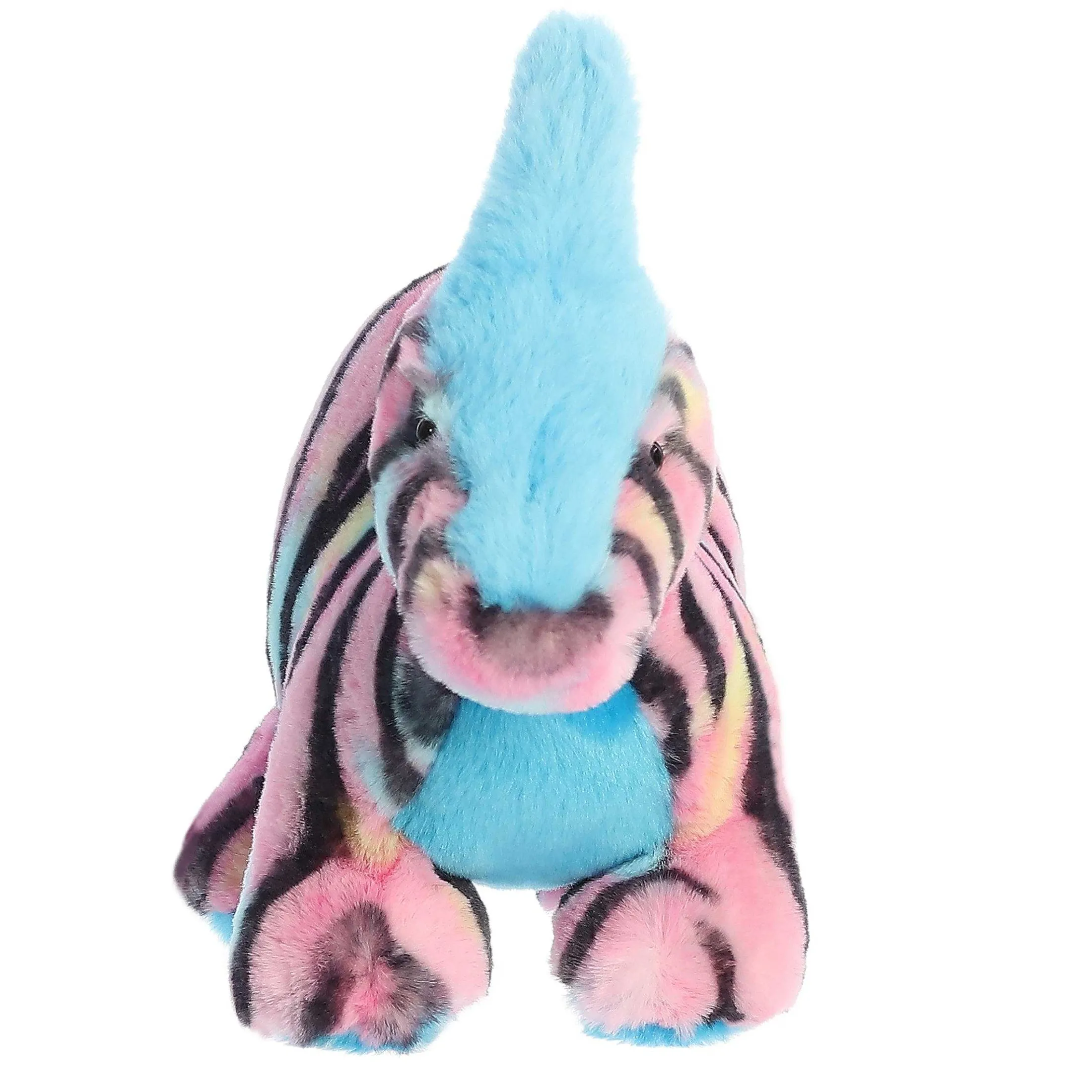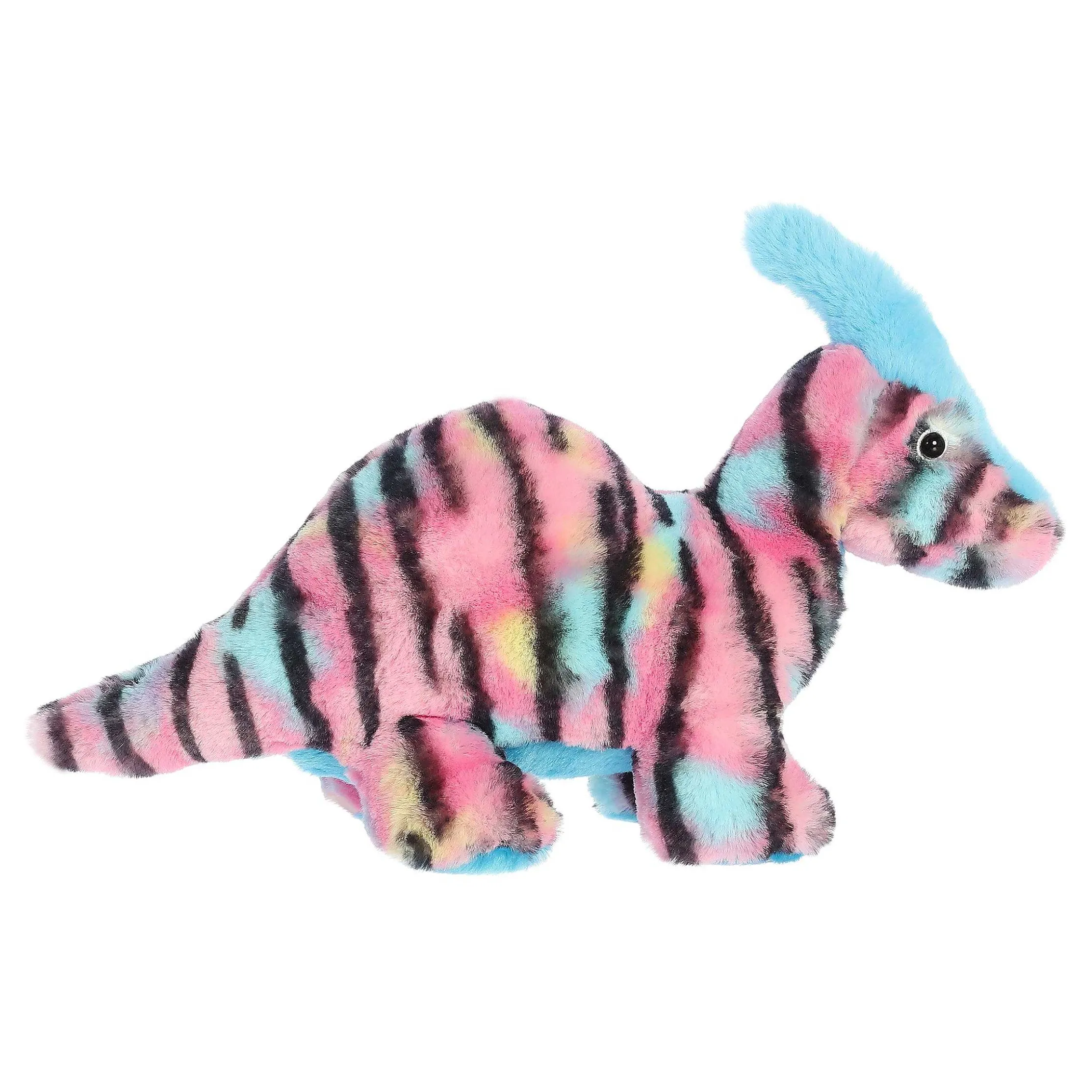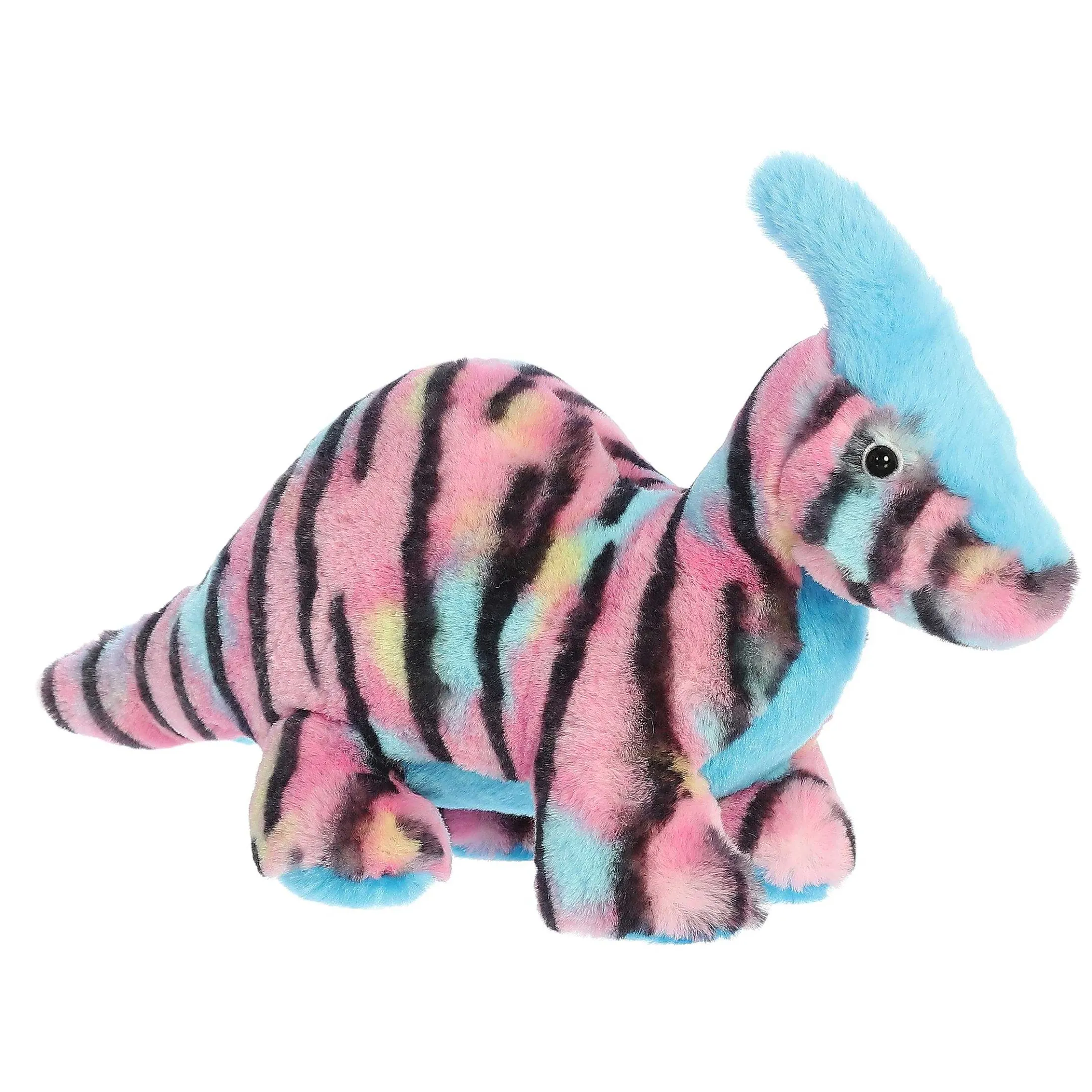 Step Into The Enthralling Domain Of Parasaur Pink, Where Artistry And Prehistoric Wonders Meld Seamlessly. Designed To Captivate And Charm, This Plush Dino Is Adorned With A Lively Pink Coat, Intricately Patterned With Bold Black Stripes That Dance In Delightful Zigzags Across Its Form. But The Allure Doesn’T Stop There! Its Underbelly Showcases A Serene Blue Hue, Complementing Its Vibrant Sky-Blue Crest – A Unique Feature That Elevates Its Visual Appeal.