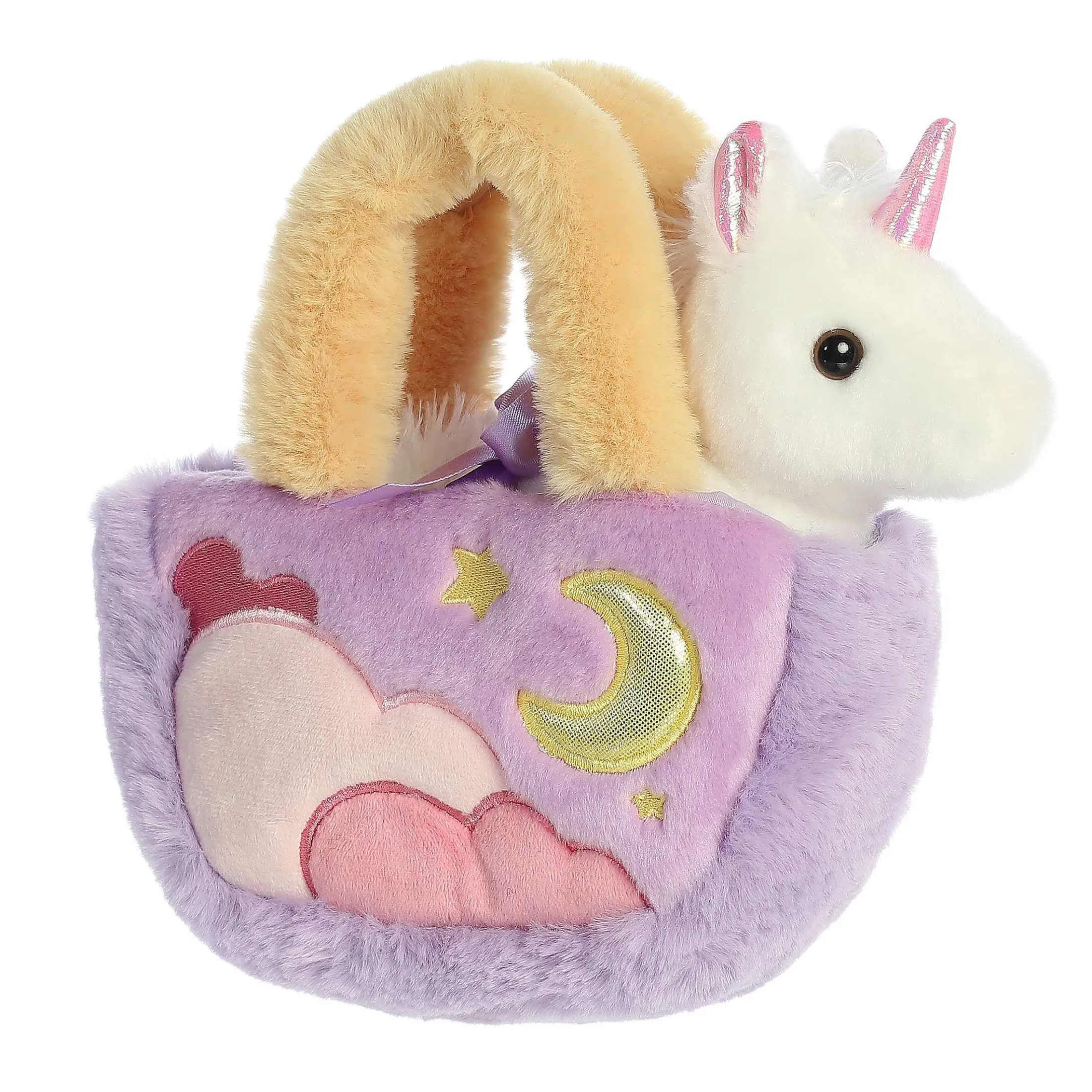 Soar Into A Dreamland With The Pastel Clouds Unicorn Plush & Celestial Carrier Set, A Part Of The Whimsical Fancy Pals Collection. This Dreamy Set Features A Soft, White Unicorn Plush With Shimmering Pink Accents, Ready To Gallop Into Your Child’S Heart. The Carrier Is A Vision In Pastel Purple, Adorned With Fluffy Clouds And A Golden Moon, Evoking A Serene Night Sky.